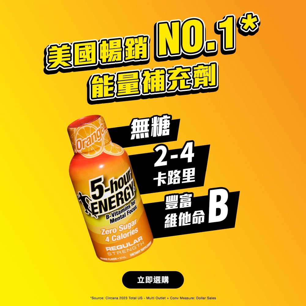 5-hour ENERGY® 袖珍裝能量補充劑蘊含重要的維他命B3, B6及B12, 而且不含糖份, 只有4卡路里, 讓你輕鬆撃退防不勝防的飯氣攻心感覺。每當倦意來襲, 快以這瓶健康飲品一shot提升集中力及能量。